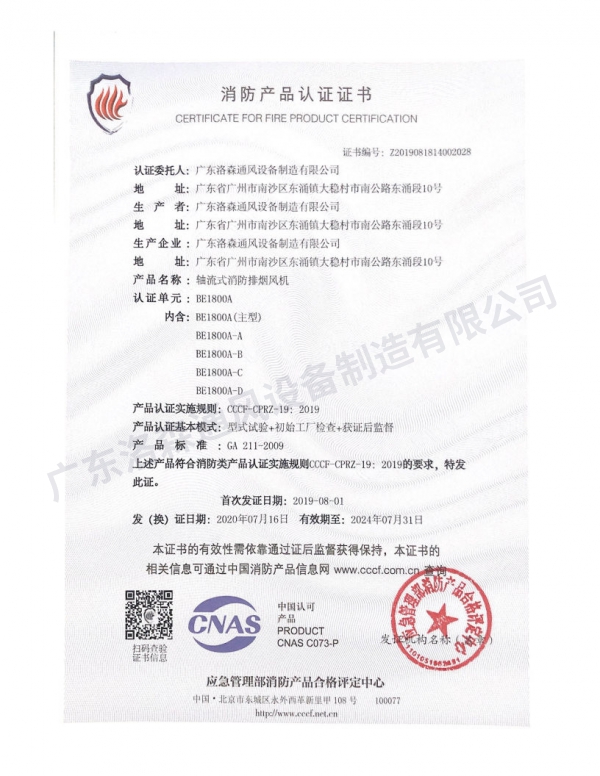 主頁(yè) > 榮譽(yù)資質(zhì) > 產(chǎn)品認(rèn)證證書(shū) > 消防產(chǎn)品認(rèn)證證書(shū)-軸流式消防排煙風(fēng)機(jī)BE1800A
