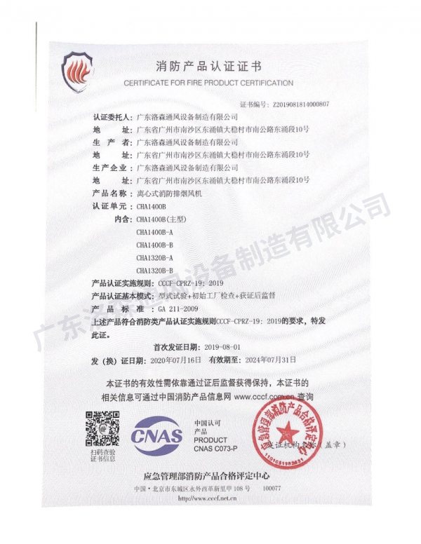 主頁 > 榮譽(yù)資質(zhì) > 產(chǎn)品認(rèn)證證書 > 消防產(chǎn)品認(rèn)證證書-離心式消防排煙風(fēng)機(jī)CHA1400B