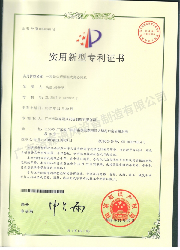 主頁 > 榮譽資質(zhì) > 專利證書 > 一種除塵后傾柜式離心風機