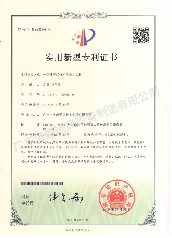 主頁 > 榮譽(yù)資質(zhì) > 專利證書 > 一種除濕后傾柜式離心風(fēng)機(jī)