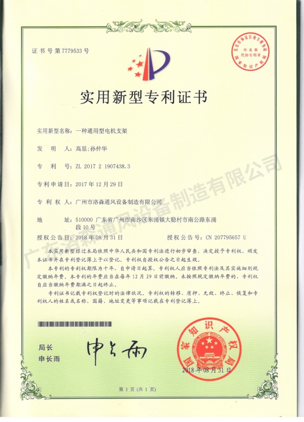 主頁 > 榮譽(yù)資質(zhì) > 專利證書 > 一種通用型電機(jī)支架