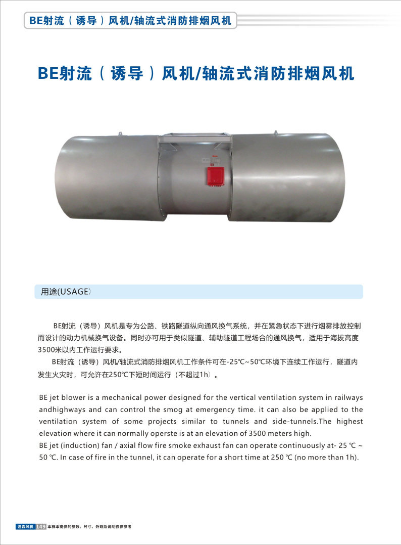 BE jet blower is a mechanical power designed for the vertical ventilation system in railways and highways and can control the smog at emergency time. it can also be applied to the ventilation system of some projects similar to tunnels and side-tunnels.The highest elevation where it can normally operste is at an elevation of 3500 meters high.