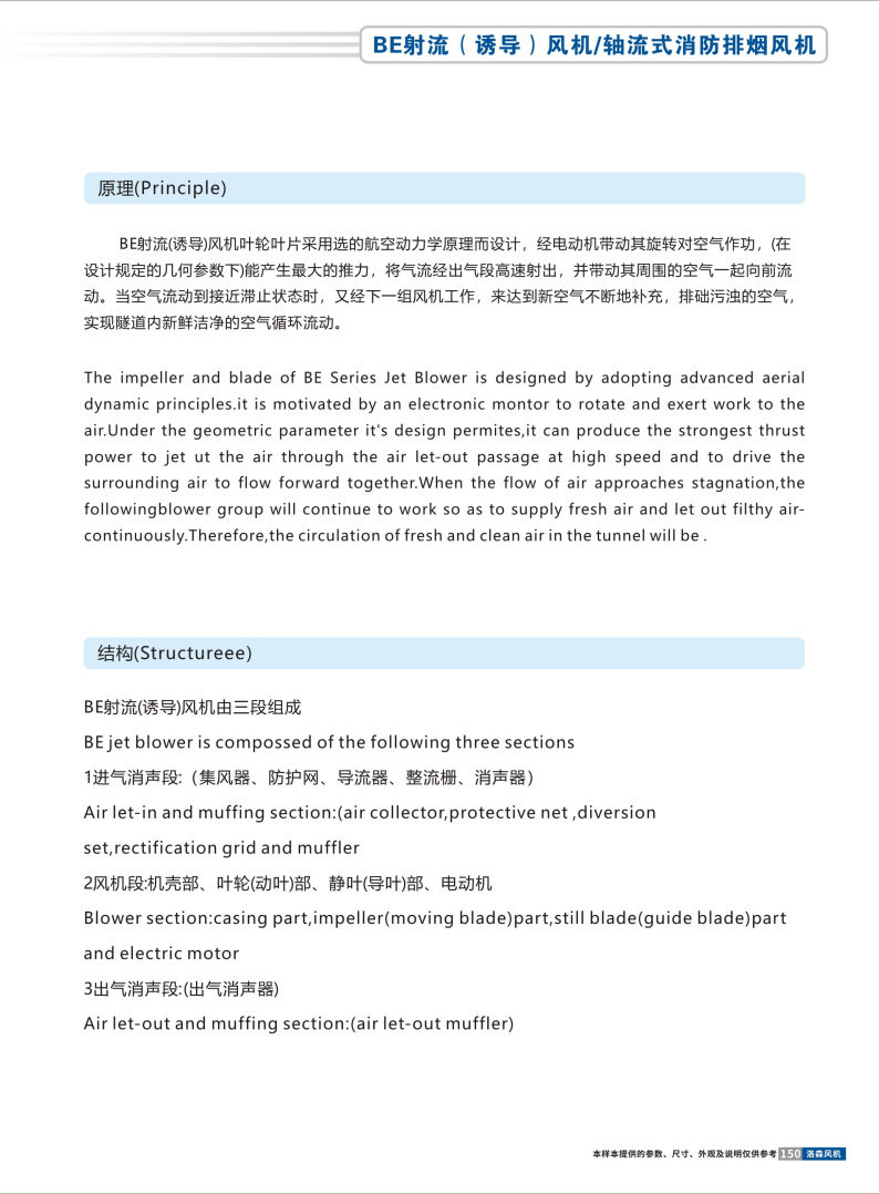 The impeller and blade of BE Series Jet Blower is designed by adopting advanced aerial dynamic principles.it is motivated by an electronic montor to rotate and exert work to the air.Under the geometric parameter it's design permites,it can produce the strongest thrust power to jet ut the air through the air let-out passage at high speed and to drive the surrounding air to flow forward together.When the flow of air approaches stagnation,the following blower group will continue to work so as to supply fresh air and let out filthy air- continuously.Therefore,the circulation of fresh and clean air in the tunnel will be .