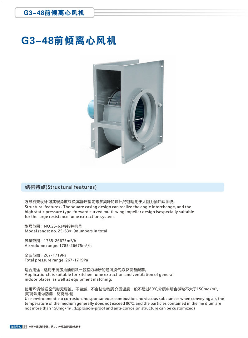 Structural features:The square casing design can realize the angle interchange, and the high static pressure type forward curved multi-wing impeller design is especially suitable for the large resistance fume extraction system.