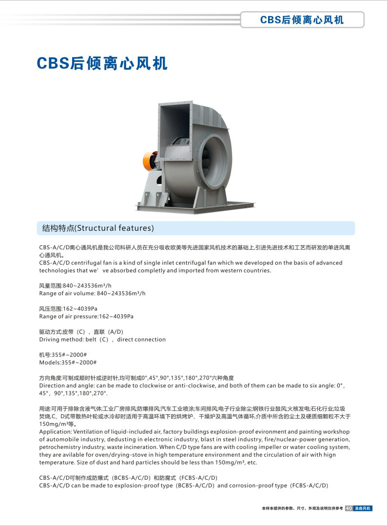 CBS-A/C/D離心通風(fēng)機(jī)是我公司科研人員在充分吸收歐美等先進(jìn)國(guó)家風(fēng)機(jī)技術(shù)的基礎(chǔ)上,引進(jìn)先進(jìn)技術(shù)和工藝而研發(fā)的單進(jìn)風(fēng)離心通風(fēng)機(jī)。
